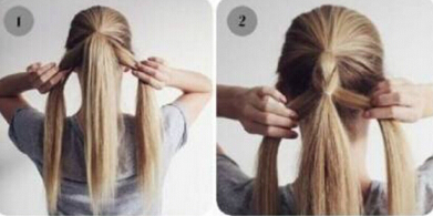 【韩式发型扎法step02】接着,把这两撮发丝并拢用一次性的橡皮圈固定在马尾中间(如图)