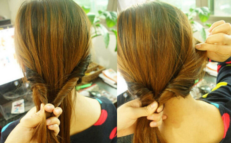 【公主头扎发step02】然后,取出两侧旁的其中一撮秀发,将其旋转扭转到中间部位即可。
