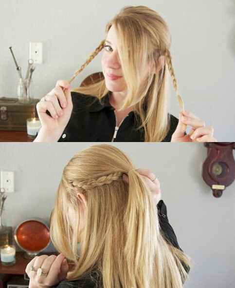 【韩式发型扎法step02】将半扎发扎好之后,从两鬓分别取出一小束的发束进行麻花辫的编织,利用橡皮圈固定即可(如图)
