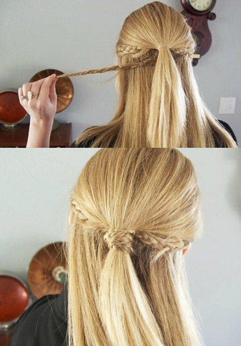 【韩式发型扎法step04】接着,把右侧的麻花辫从扎发的下方穿过之后,围绕着半扎发固定的地方一直环绕,直到发尾结束后固定于发圈中。