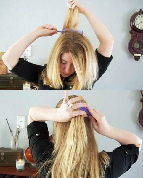 【韩式发型扎法step01】首先,将头发梳理整齐之后,将中间的部分秀发扎成一个半扎发的造型即可(如图)