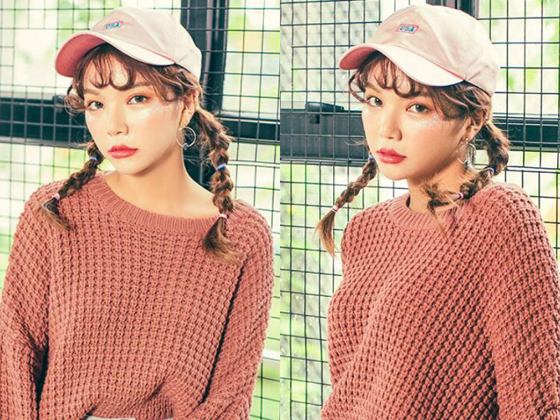 卷翘的刘海随意贴着额前,看起来个性十足,由于妹子头发较细少,所以编成的两条辫子也特别细小,利索的垂在肩膀两边,头戴棒球帽,加上棕色发色,有点街头潮流之范。
