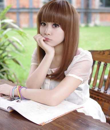 甜美范十足的中长直发发型,前面齐刘海,带给人甜美感,染色的浅棕发色更添时尚,内扣感的两颊发尾,修脸+减龄同时做到!美眉最爱哦!