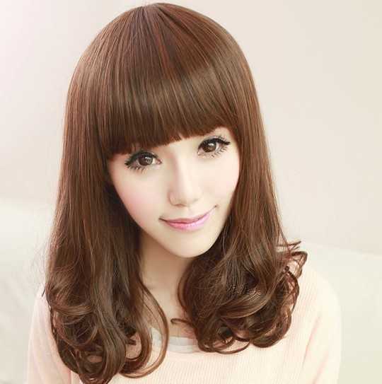 深棕色的染发的中长直发梨花头时尚抢眼,发尾内卷的弧度包裹了女生的脸部,呈现出精致小脸,齐刘海的设计更是把灵活的大眼睛完美衬托出来,浓郁的文静甜美的乖乖女气息