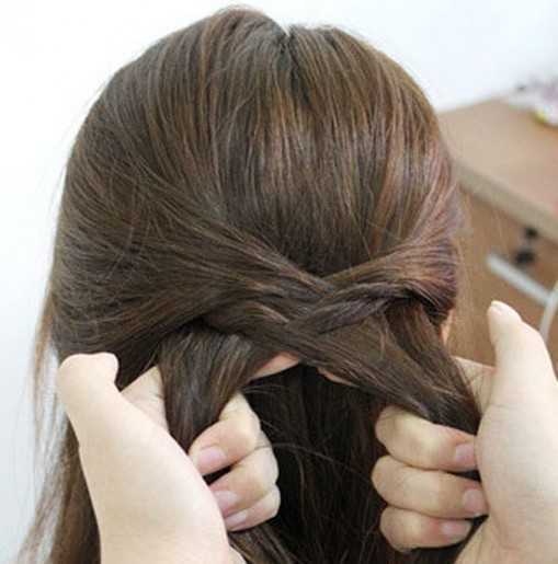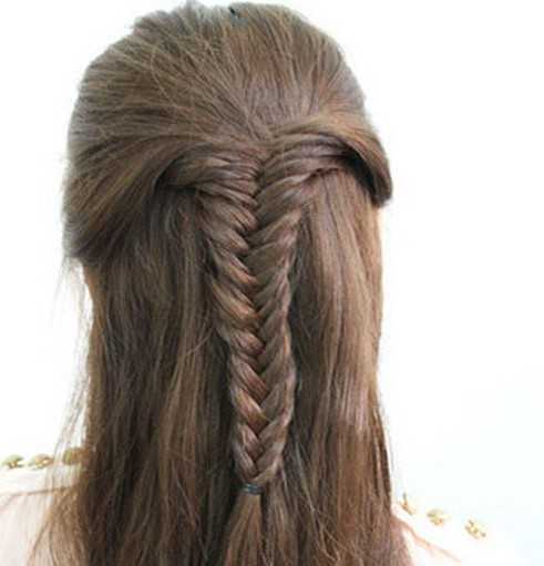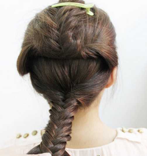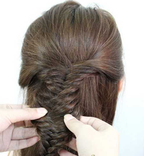 5、同样把下部分的头发按照鱼骨辫法进行编织。