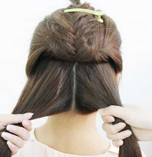 4、这时把上部分编织好的头发使用大夹子固定好,再把下面的长发分为两部分。