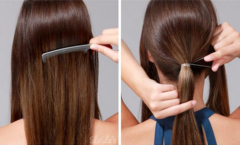 【马尾扎发教程step02】接着,再将中间部分的秀发梳理一遍之后,用一次性橡皮圈将中间的秀发绑成一个马尾形状。