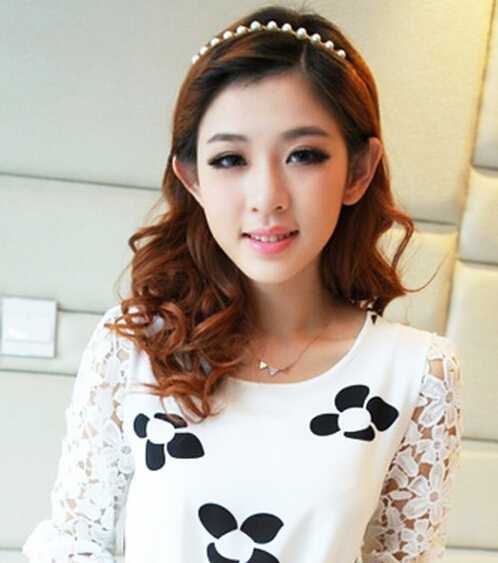 蓬松卷烫发的中长发型设计,棕色染发靓丽显肤色,带点甜美风格的发箍点缀,穿搭白色蕾丝裙,打造最清新气质的OL风格。