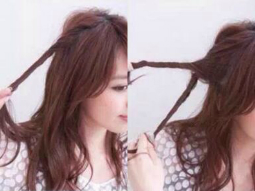 将发束旋转,扭成一条发辫,之后再从发辫后取出一小束头发,按照上述方法将其变成一条发辫,尔后将两条发辫缠绕在一起。