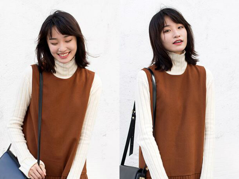 长度刚好在锁骨位置的发型没有短发那么干练,也没有长发那么飘逸,却给人清新的感觉。妹子一头乌黑的发丝看起来是那么的纯净自然,发尾贴着肩头清爽利落,微微斜分的刘海贴着额头更是巧妙的修饰了脸型,让妹子的脸型看起来柔和很多。