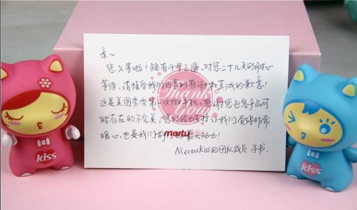 细细一看居然还有一张手写信,一下子感动内牛有木有哇!十多年没收过手写信,忽然是美图kiss的萌妹纸写来的,太感动啦~~