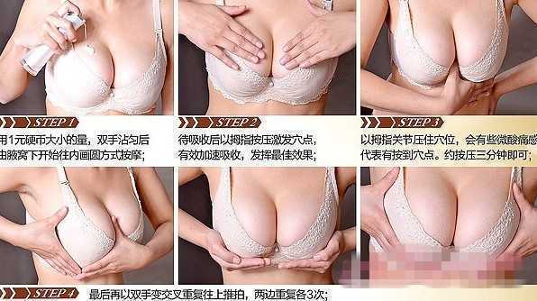 步骤:首先从乳房的中心开始画圈,然后往乳房的外缘开始,以画小圆圈的方式做螺旋状按摩,然后两个手掌轻轻的抓住两边的乳房,微微向上拉,注意力度要适度,每个动作重复10次,每天坚持5分钟即可,重点是不花钱就能轻易丰胸,想要丰胸的MM们还不赶紧学一学。