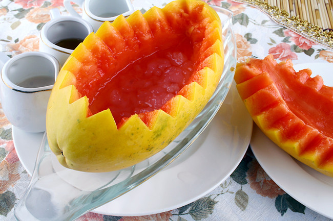 2、最后把剩下的材料放进木瓜内,入锅蒸熟。