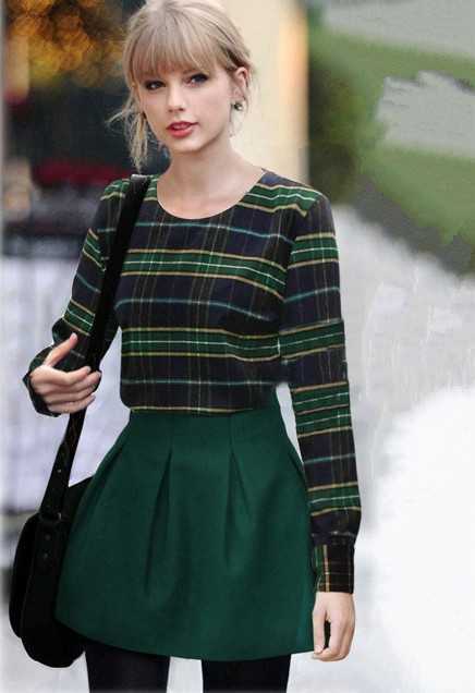清新的轻松毛呢短裙,潮流的格子毛呢上衣,轻松穿出欧美时尚风,随意拎着黑色大包包,尽展时尚感十足。