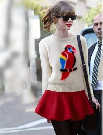 精美的鹦鹉印花毛衣,清新又百搭,鲜艳的红色毛呢百褶短裙,穿出欧美时尚感,让你春日靓丽出行。