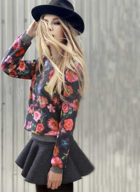 复古的花朵印花加厚卫衣,甜美感的百褶毛呢短裙,散发出迷人小女人气质,飘拂着的时尚黄色秀发,尽展欧美大牌时尚范儿。