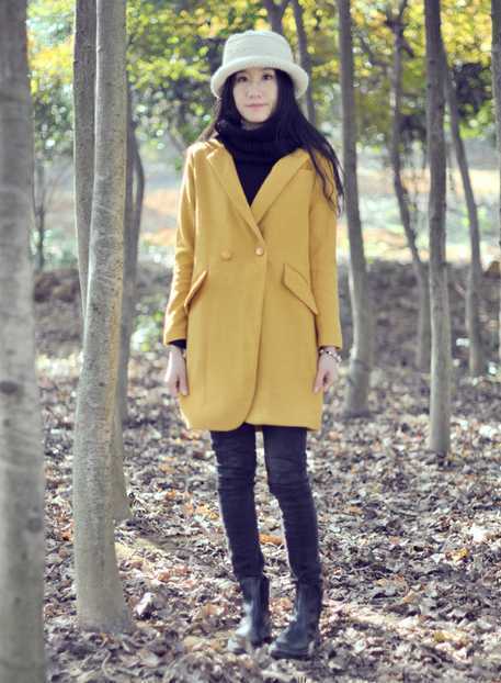 最近流行的姜黄色大衣,随心搭配黑色毛衣,低调又显时尚感,轻松穿出亮眼靓丽约会装扮。