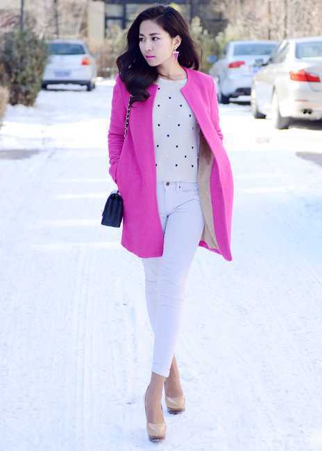 亮眼的玫红色颜色,很显润红白色肤色,简约又百搭的春季薄款大衣,让你约会当天美美出席。