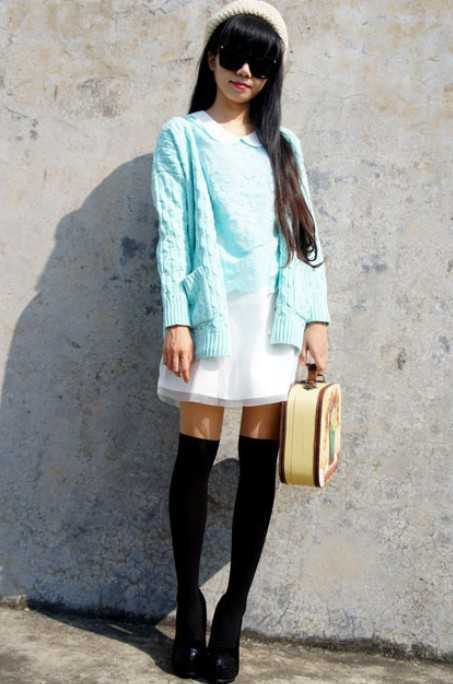 一眼看上去水蓝色很迷人,宽松款的雪纺连衣裙,搭配同色系的水蓝色麻花针织开衫,穿出扑鼻清新的感觉,让你怎么穿都很美。