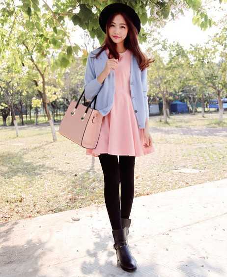 超美的粉红色春季打底连衣裙,搭配水蓝色针织开衫,给人一种乖巧的感觉,穿出精致女人气质,让你美翻整个春天。