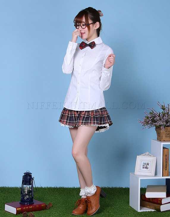 格纹蝴蝶结装饰的学院风衬衫,清新自然,搭配一条格子半身裙,整身穿搭呈现浓郁的学院风,很气质。