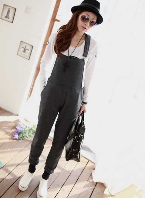 春季深灰色休闲背带裤,百搭又显时尚感,随心搭配白色T恤和白色帆布鞋,尽展青春活力感,最适合学生一族妹子们了。