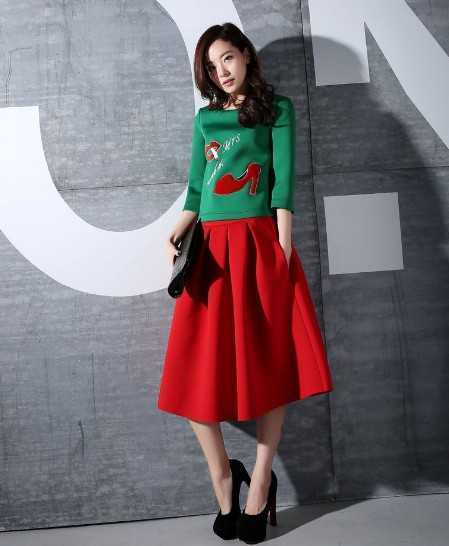 充满春天气息的2014年春季青色卫衣套装,精美的高跟鞋图案,显得格外的优雅大气,百褶鲜艳红色半身裙,穿起来很时尚摩登范儿。
