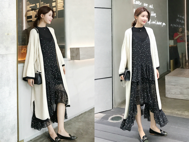 春天总是少不了一条碎花裙子,洋溢着春天浪漫的气息,百褶裙摆的黑色碎花裙,多层次不规则的设计,拖曳的裙摆走路自带优雅气质,外搭一件白色长款针织衫,凸显女生曼妙的身姿。