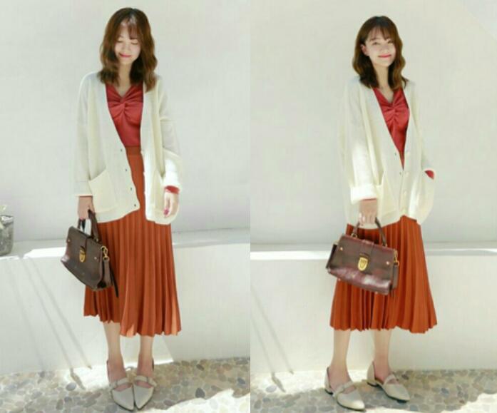 春天就是要点多彩的颜色,橘色的百褶裙,风琴般褶皱轻盈灵动,衬托女生优雅气质,上衣搭配一件短款白色的针织衫外套,更显女生的娴淑,自然端庄大方,穿上舒适的时尚平底单鞋,就可以美美的出门啦。