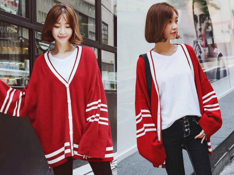 这款红色的中长款针织开衫时尚感爆棚,红色特别的亮眼,青春又有活力,特别地引人注目,条纹的撞色设计增添了潮流感,很有视觉的冲击力,落肩的肩线慵懒惬意,敞开来穿休闲随意又有个性。