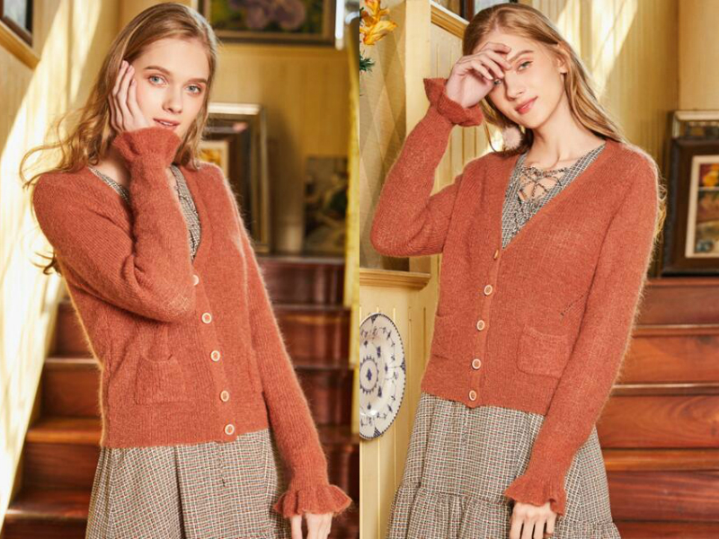少女感十足的短款针织开衫减龄又时尚,上身还有拉长身材比例的效果,大大的V字领口,露出性感锁骨,袖口甜美的木耳边设计,流露出优雅气质,无论是系扣还是随性敞开来穿,都能营造出你想要的时髦效果。