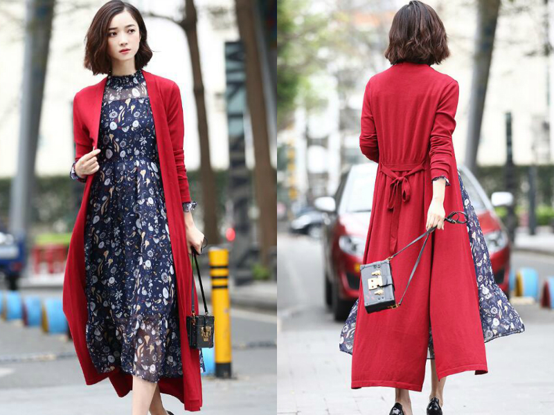 长款的针织开衫能很好的拉长身高,穿着起来特别的高挑显瘦,衣摆开叉的设计走路带风,时尚又有型,腰带的设计增添了优雅气质,醒目的红色特别抢眼,让你成为街头的一道美丽风景线。