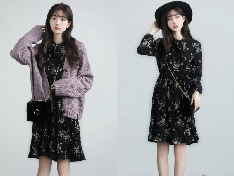 黑色碎花的连衣裙总能给人一种小清新淑女的感觉,用来打底穿着外搭一件紫色针织衫,经典的穿衣搭配永远都不会过时。