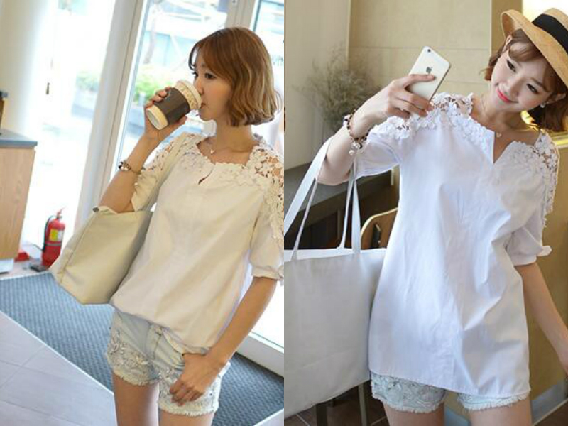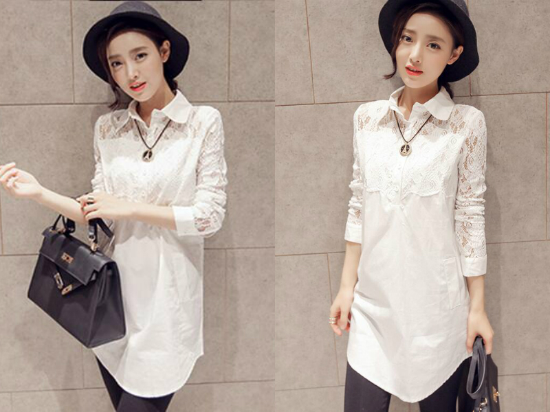 宽松的大码蕾丝衬衫比较舒适,不挑身材,每人都适合穿,衬衫领子设计简洁干练,钩花镂空的蕾丝拼接给人清新浪漫的感觉,两侧还有贴心的口袋,也是时尚百搭的衬衫。