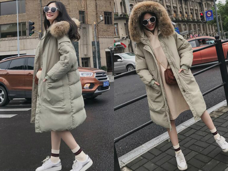 看起来比较简约的一款羽绒服,长长的版型保暖又显瘦,插袋的口袋设计让你的双手随时取暖,连帽设计休闲实用,加上一大圈棕色毛领,光是看着就觉得很暖和了,怕冷的胖mm不妨大方选择这款哦。