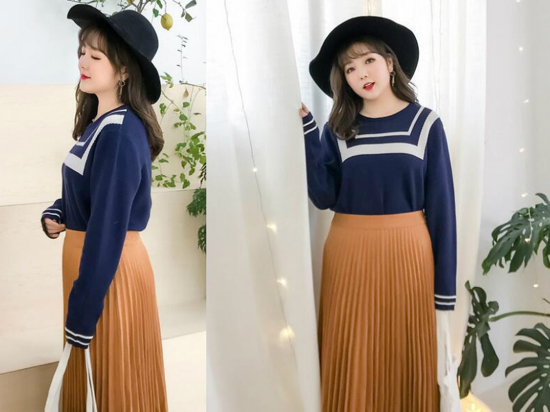 胖mm好像总会给人很臃肿的感觉,似乎永远与小清新不沾边,不过看妹子穿得不就很小清新么?深蓝色的毛衣加入白色条纹,经典的撞色设计独特而有个性,充满学院气息,圆形领简约大方,使妹子看起来萌萌哒。