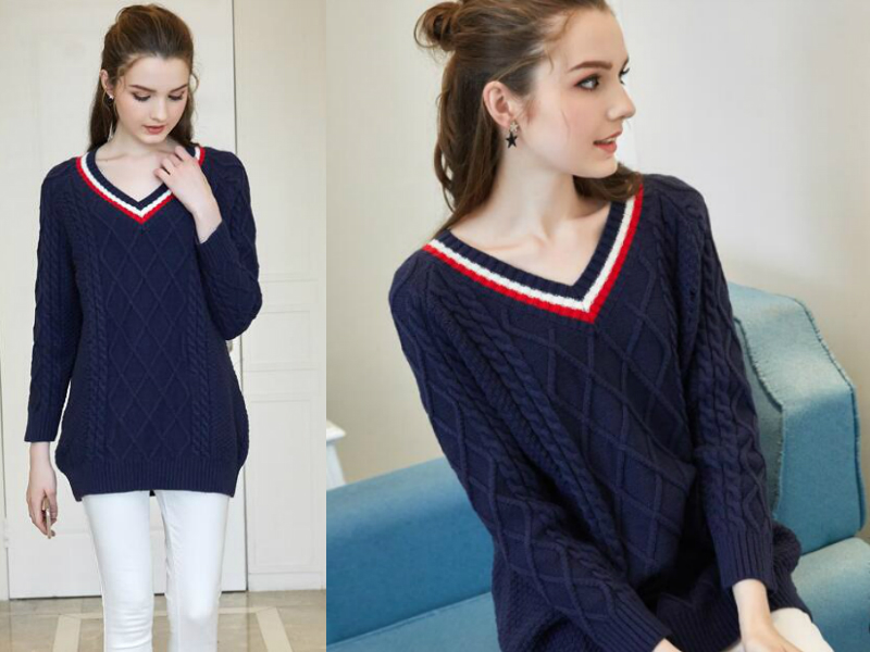 喜欢这样的毛衣吗?撞色的V领设计不经意间展现出妹子精致的锁骨,看起来性感迷人,通体菱形织花设计新颖而立体有型,下摆的罗纹收口修饰身段曲线,加上中长的款式恰好遮住臀部,拉长身形之余更遮肉显瘦哦!