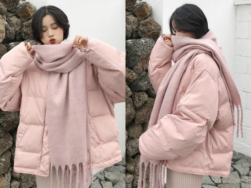 流行的原宿风短款大码羽绒服,立体的茧型简约大方,面料光滑很有质感,蓬松而柔软,宽松的版型可以遮挡胖胖的上身,而粉色让人看起来年轻时尚,围上围脖,内搭白色或粉色的毛衣裙就已经很潮。