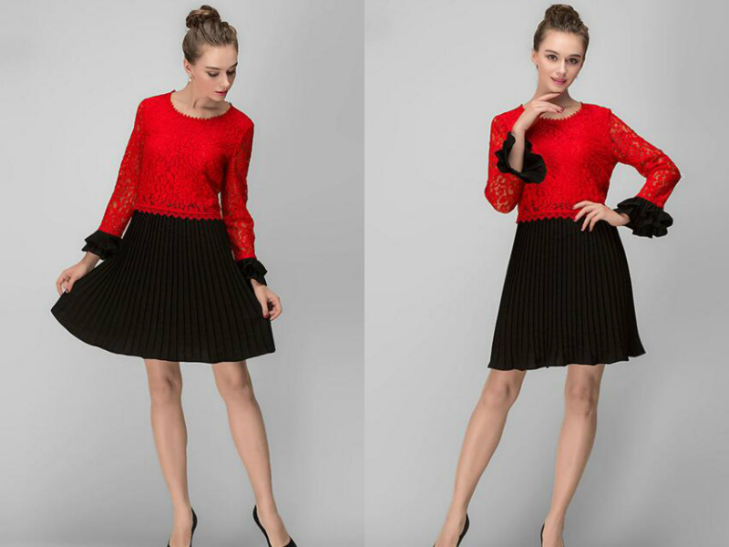 蕾丝上衣和百褶裙假两件装造型感很强,红和黑的撞色设计很有视觉冲击力,加上百褶裙的融入,修身显瘦同时,打造飘逸轻盈感,蕾丝花边点缀的简约圆领,立体蕾丝花纹图案,彰显活力的黑色喇叭袖口,让蕾丝裙很有质感,时尚又典雅。