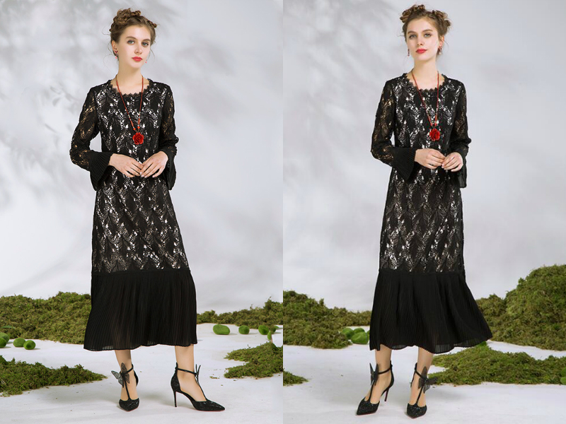 修身廓形过膝长款的大码女装蕾丝裙,花边的圆领,拼接百褶的喇叭袖口,很有设计的心思,衣身上性感蕾丝精致华美,充满浪漫气息,上身端庄得体,裙摆百褶拼接,律动感十足,自然垂坠曼妙灵动,尽显优雅气质。