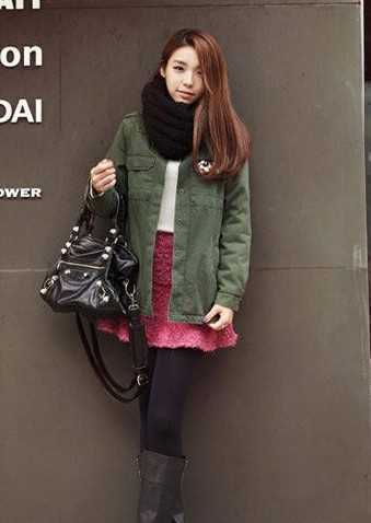 粉红色短裙会不会觉得是甜美女孩的专款单品呢,穿上一条甜美粉红色短裙,配上一件军绿色夹棉风衣,撞色配搭,显得你性感可爱甜美。