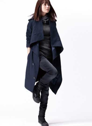 大胆张扬的斜门襟羊绒外套,与深蓝色融合,低调又不失时尚感,宽松版的外套在腰间系上修身的腰带,减少宽松感,凸显出纤细的腰身曲线,穿出个性时尚的熟女韵味。