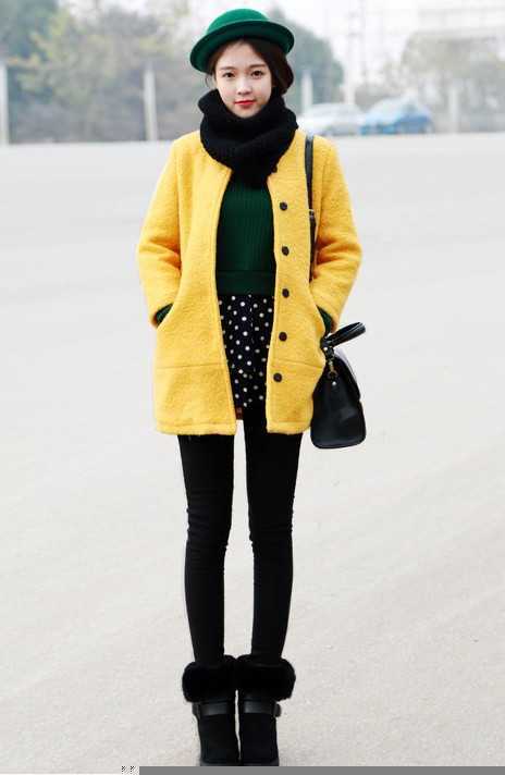 黄色的毛呢外套很抢眼,也是一款百搭的毛呢外套!内搭一件墨绿色的上衣,下身穿上黑色的紧身裤。这是甜美又抢眼的淑女范儿!