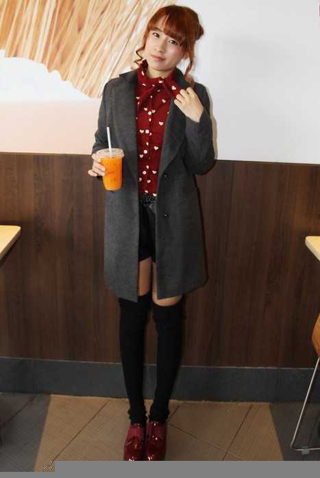 灰色的长款毛呢外套是西装版型,带着几分帅气感。可以内搭一件酒红色的衬衫,下身搭配黑色皮质的小短裤也是极好的。这样的搭配是帅气的韩系风格。