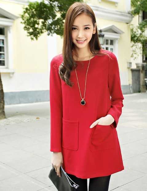 宽松款式,精致的口袋设计,时尚又大方,2014年韩版的毛呢连衣裙,配上洋气红色调,穿出小清新冬日装扮。