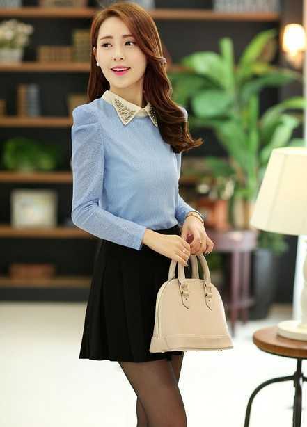 水蓝色修身的款式,立体时尚的水钻领子装饰着,穿起来特别时尚优雅,随意混搭深色系大衣,冬日轻松穿起时尚气质型女性魅力。
