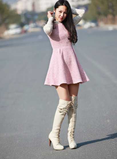甜美的粉嫩无袖连衣裙,修身加厚的毛呢面料,穿起来非常甜美可爱,随意穿搭白色绑带式过膝长靴,尽展时尚十足女人味。