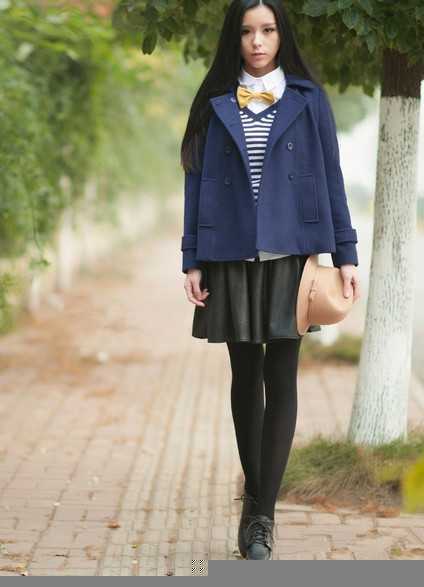 藏蓝色的冬季斗篷毛呢外套,独特时尚的款式,混搭皮质短裙,散发出气质迷人魅力,轻松穿出英伦范冬日装扮。