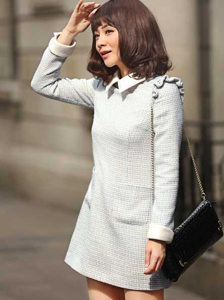 淡淡的清幽蓝色,甜美的白色立体领子内搭连衣裙,穿出优雅小香风气质,加厚加绒的内里连衣裙,温暖与时尚兼备。