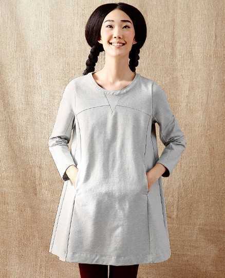 独特拼接款式,低调浅灰色套头连衣裙,散发出恬静文艺气息,穿出时尚大气范儿,轻松内搭复古红打底裤,穿出个性时尚的文艺范。